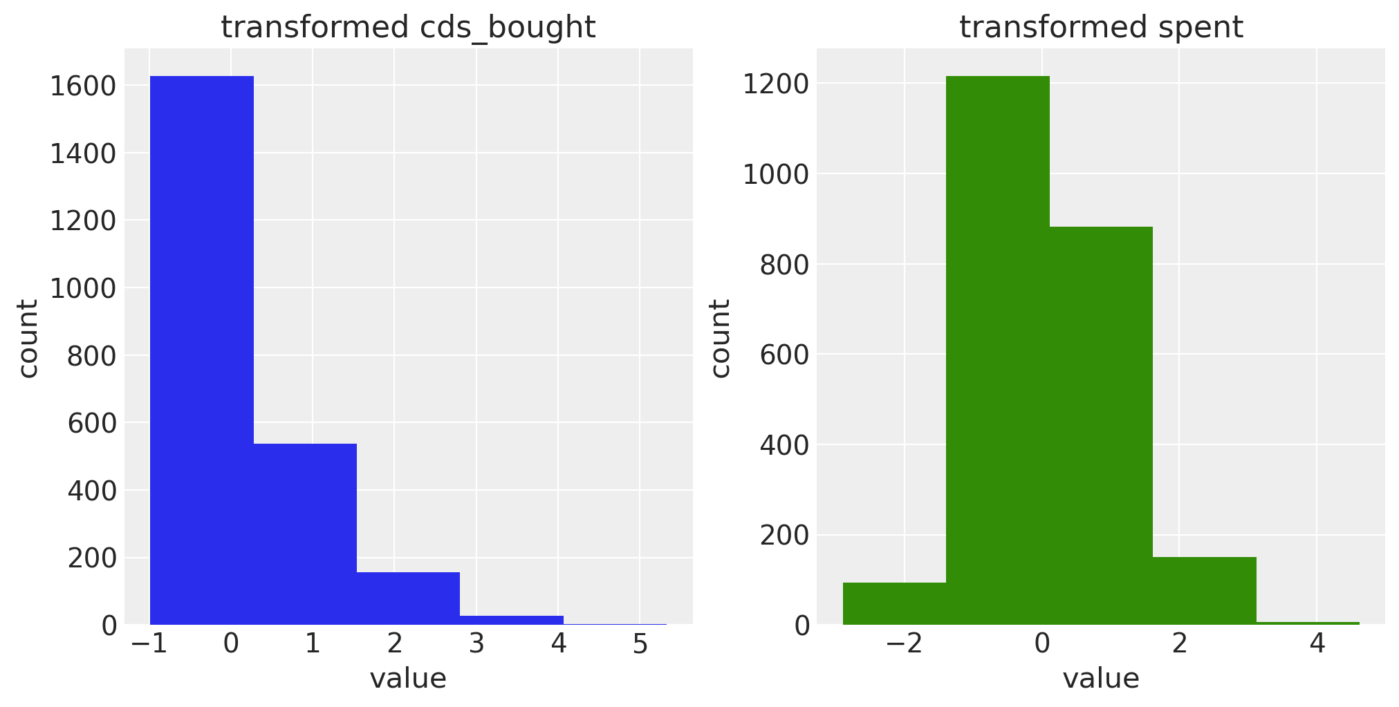 ax[0].set(title=f"transformed {ax[1]}", xlabel="value", ylabel="count")