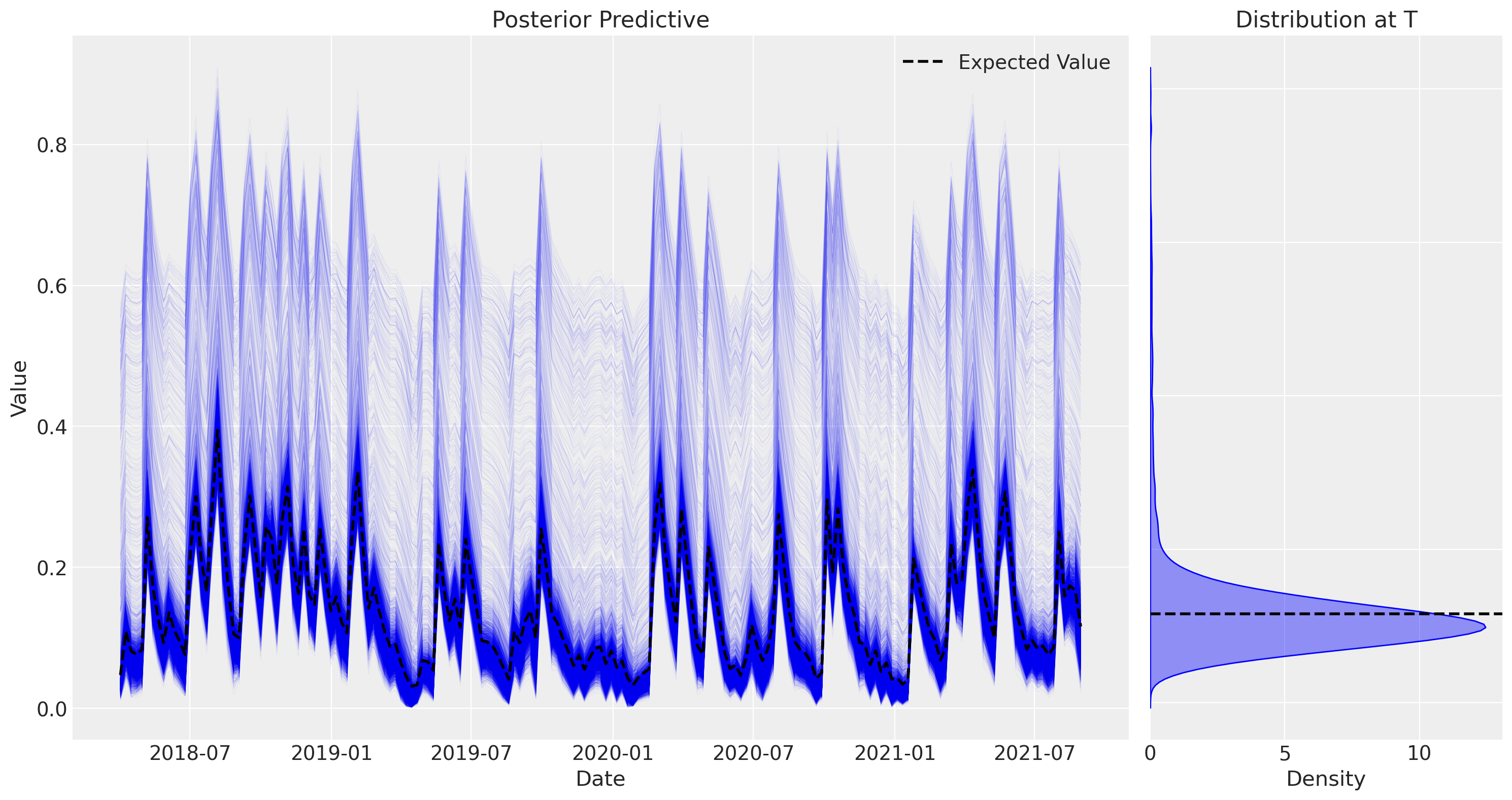 where \(\lambda_{t}\) is the time-varying component modeled as a latent process. This shared time-dependent variation \(\lambda_{t}\) allows us to capture the overall temporal effects that influence all media channels simultaneously.