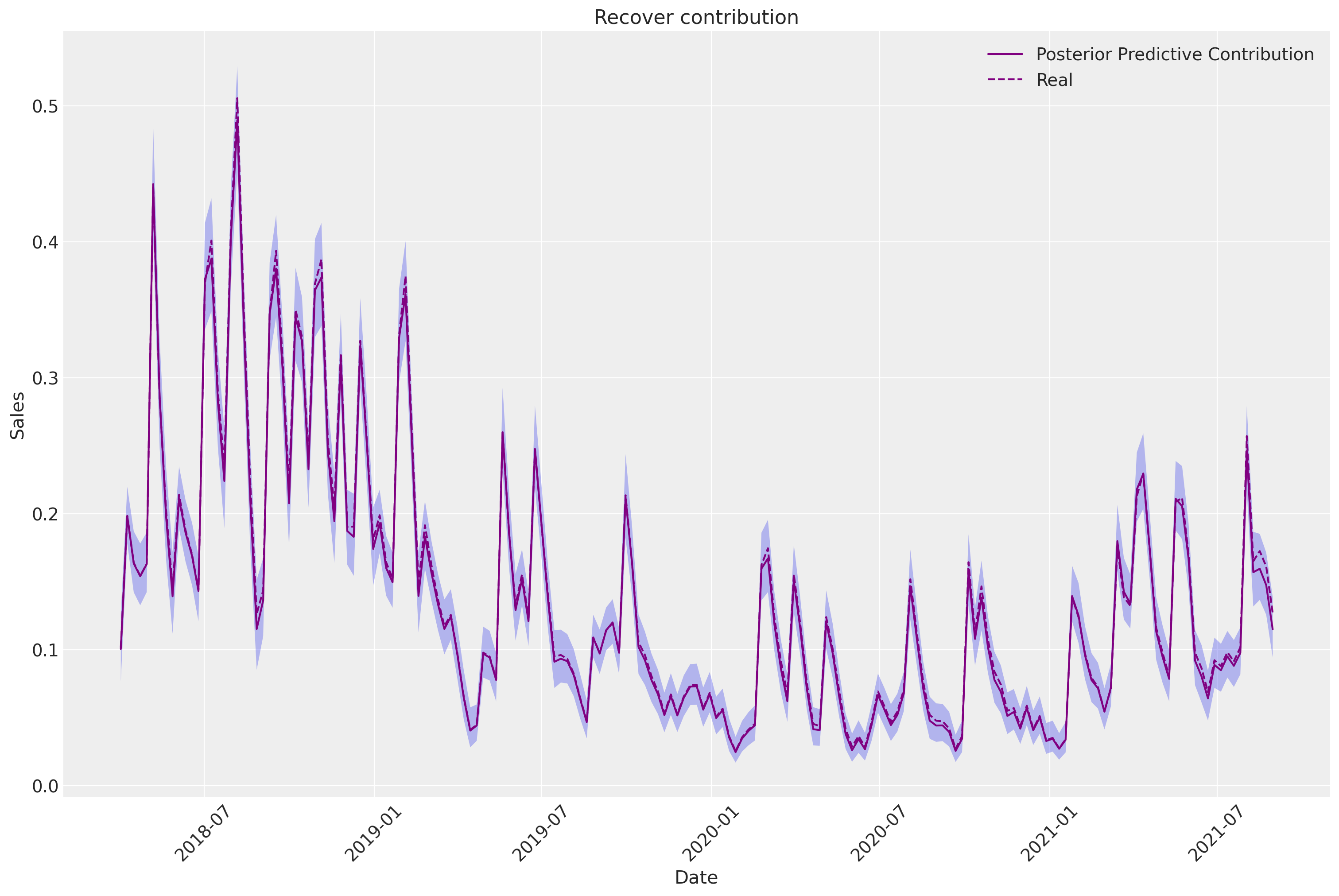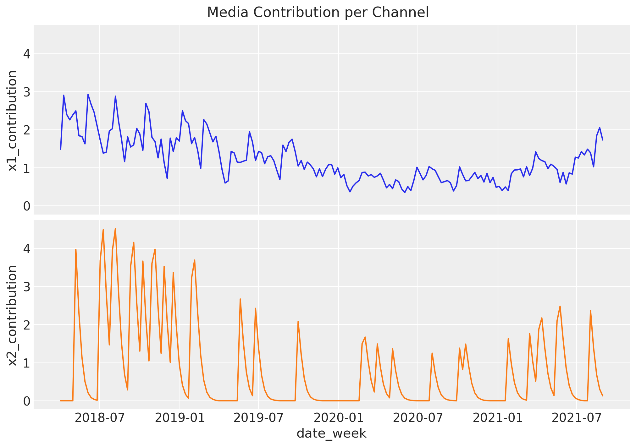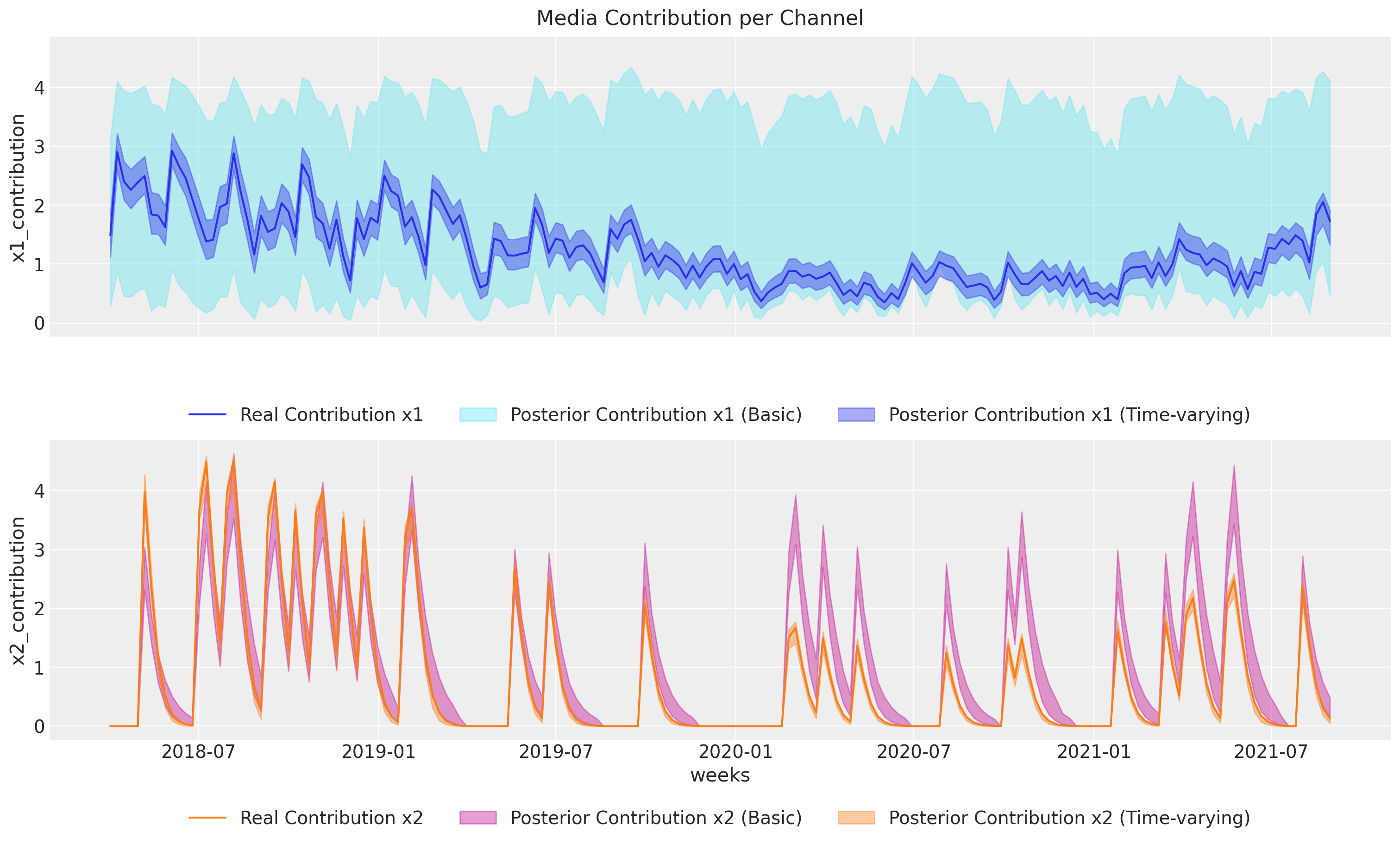 Contributions per channel were also recovered correctly, unlike our first model! Actually, we see how the base model tries (and fails!) to capture the true variation. The reason is clear: lack of flexibility.