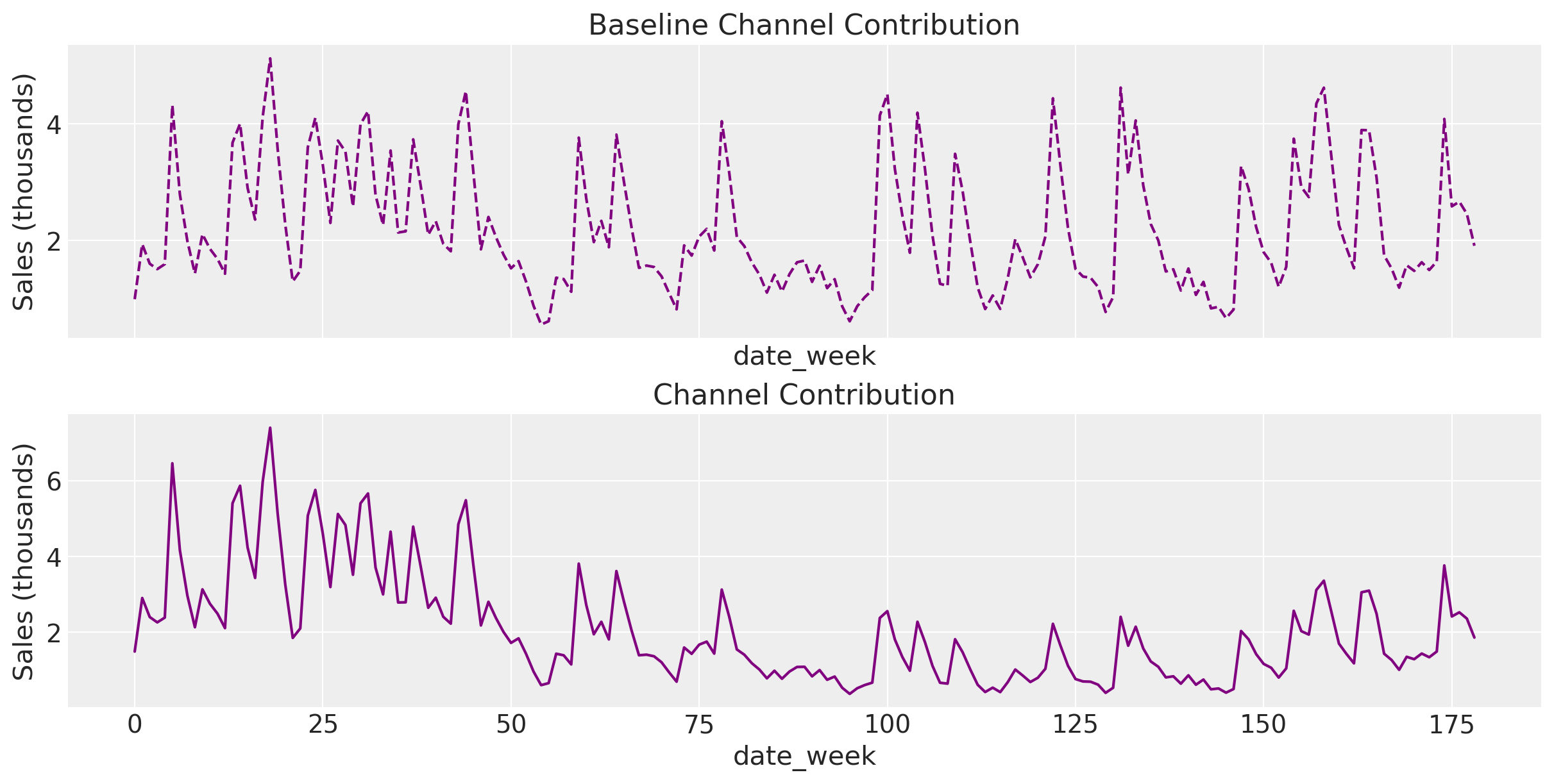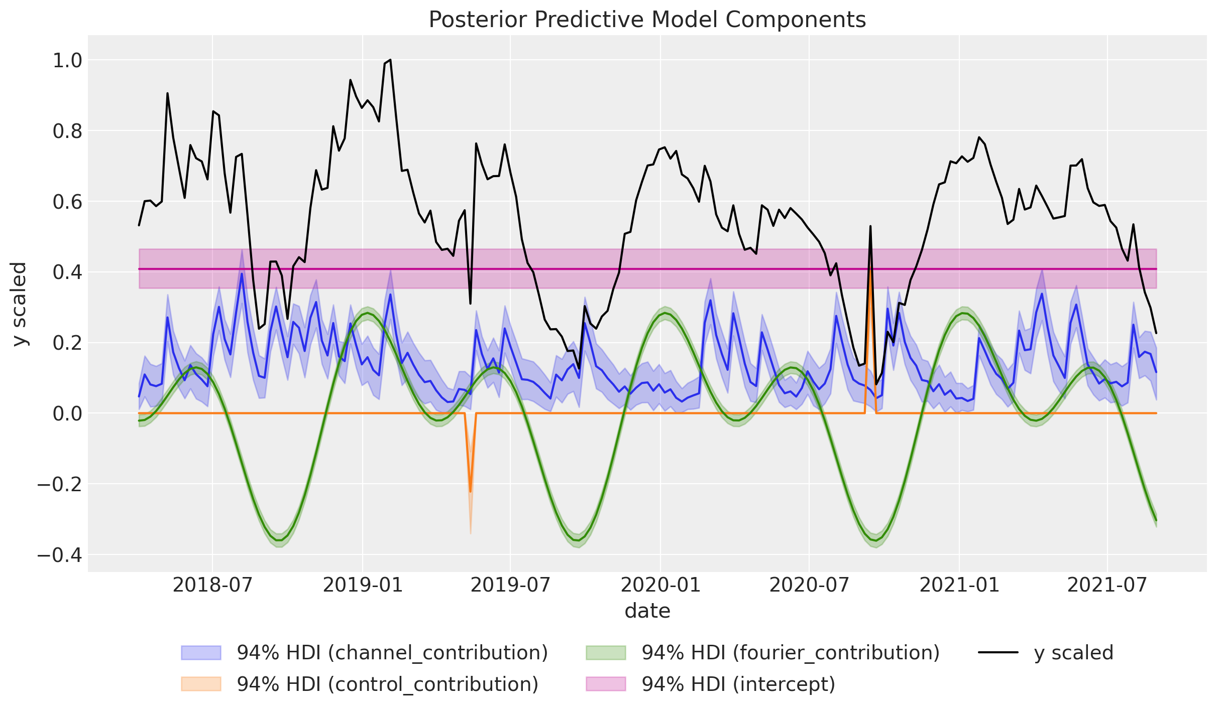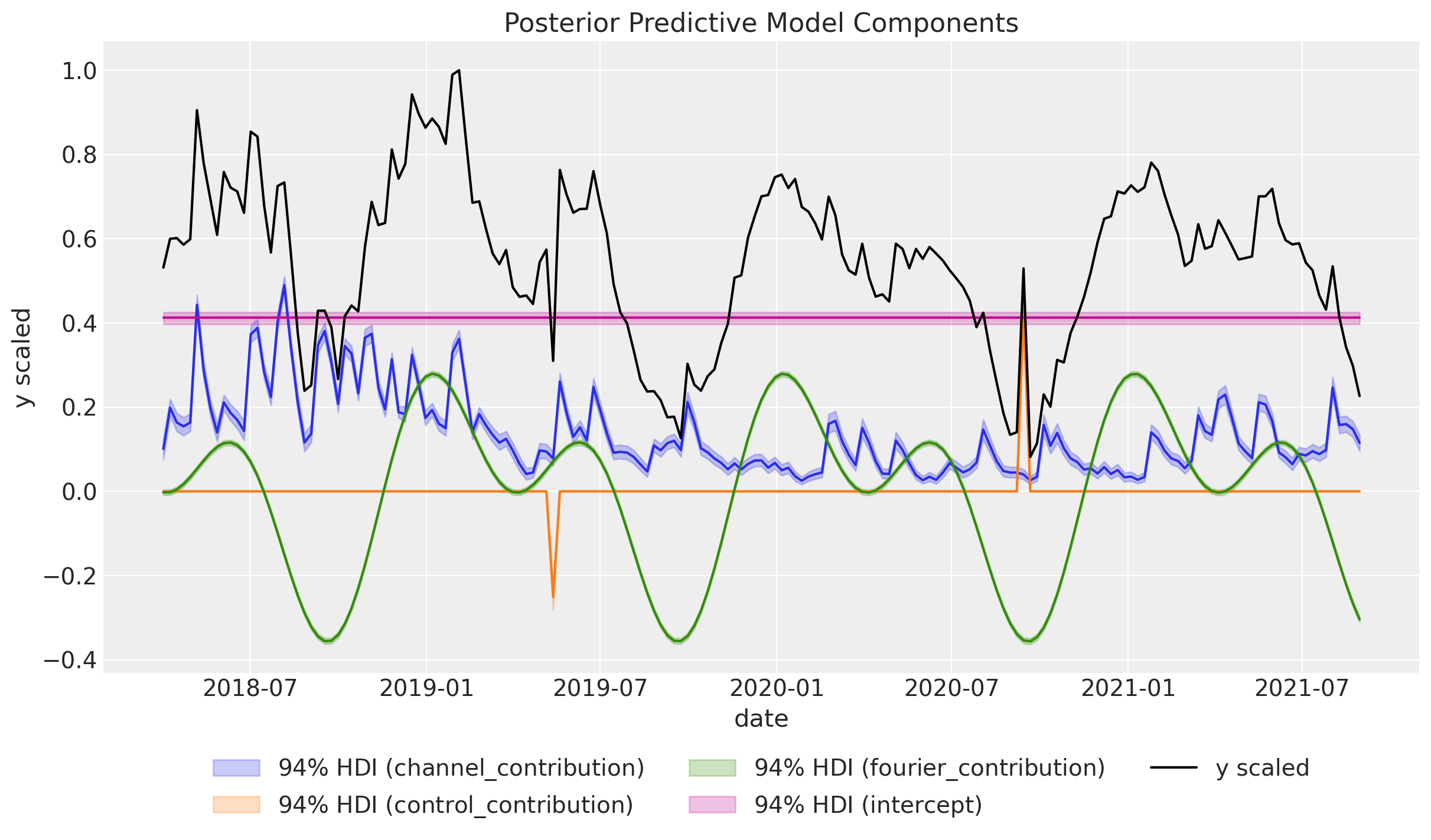 Throughout this notebook, we have explored the implementation of a Bayesian Marketing Mix Model (MMM) using PyMC, comparing the performance and insights gained from models with and without a time component. The key takeaway from our analysis is the significant advantage of incorporating time-varying factors into MMM.