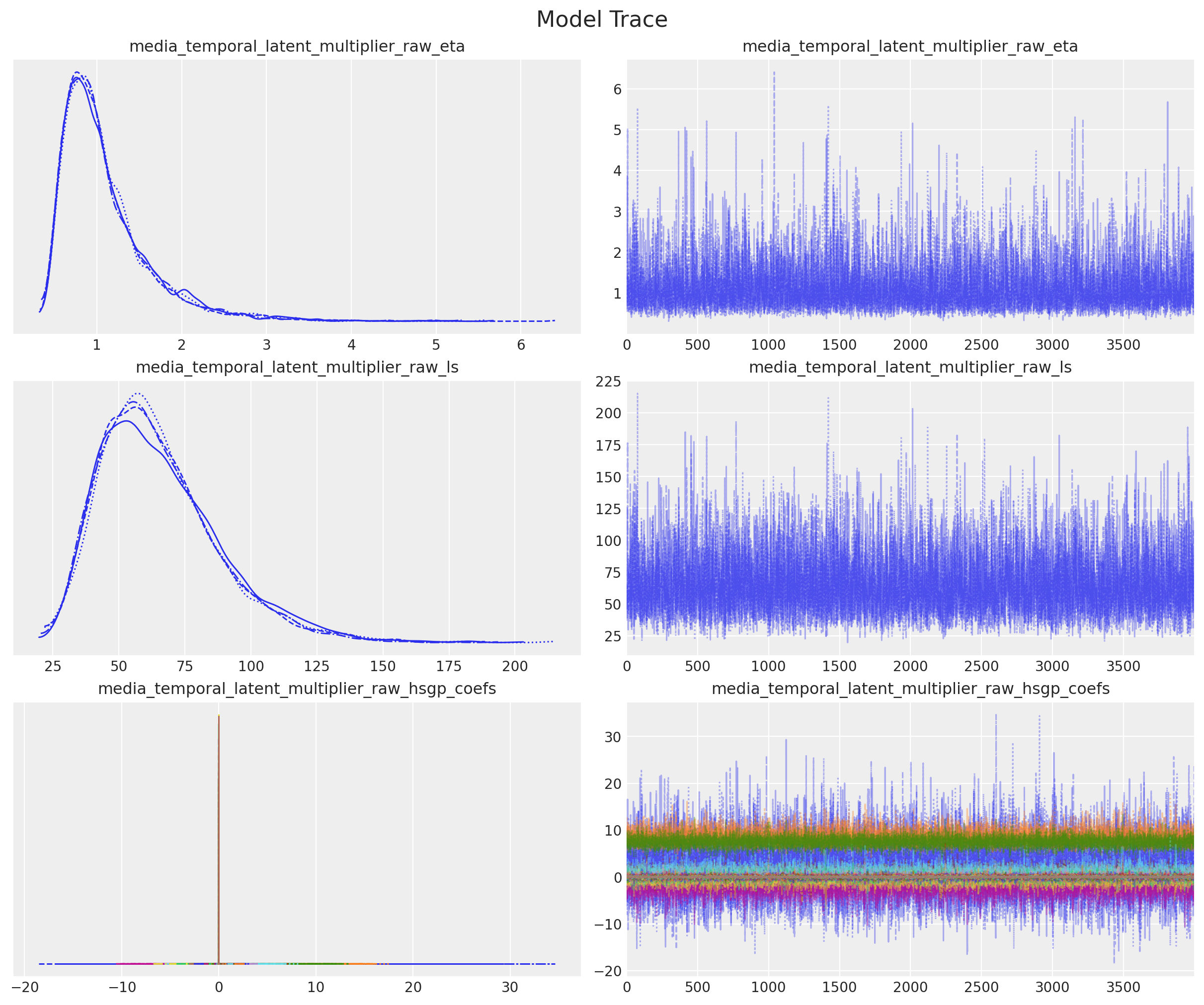 In real-world scenarios, the effectiveness of marketing activities is not static but varies over time due to factors like competitive actions, and market dynamics. To account for this, we introduce a time-dependent component into the MMM framework using a Gaussian Process, specifically a Hilbert Space GP. This allows us to capture the hidden latent temporal variation of the marketing contributions.