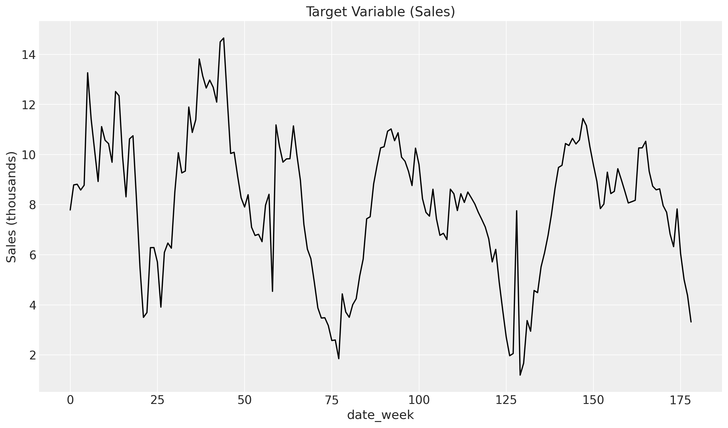 In Part I of this notebook we focus on the data generating process. That is, we want to construct the target variable \(y_{t}\) (sales) by adding each of the components described in the Business Problem section.